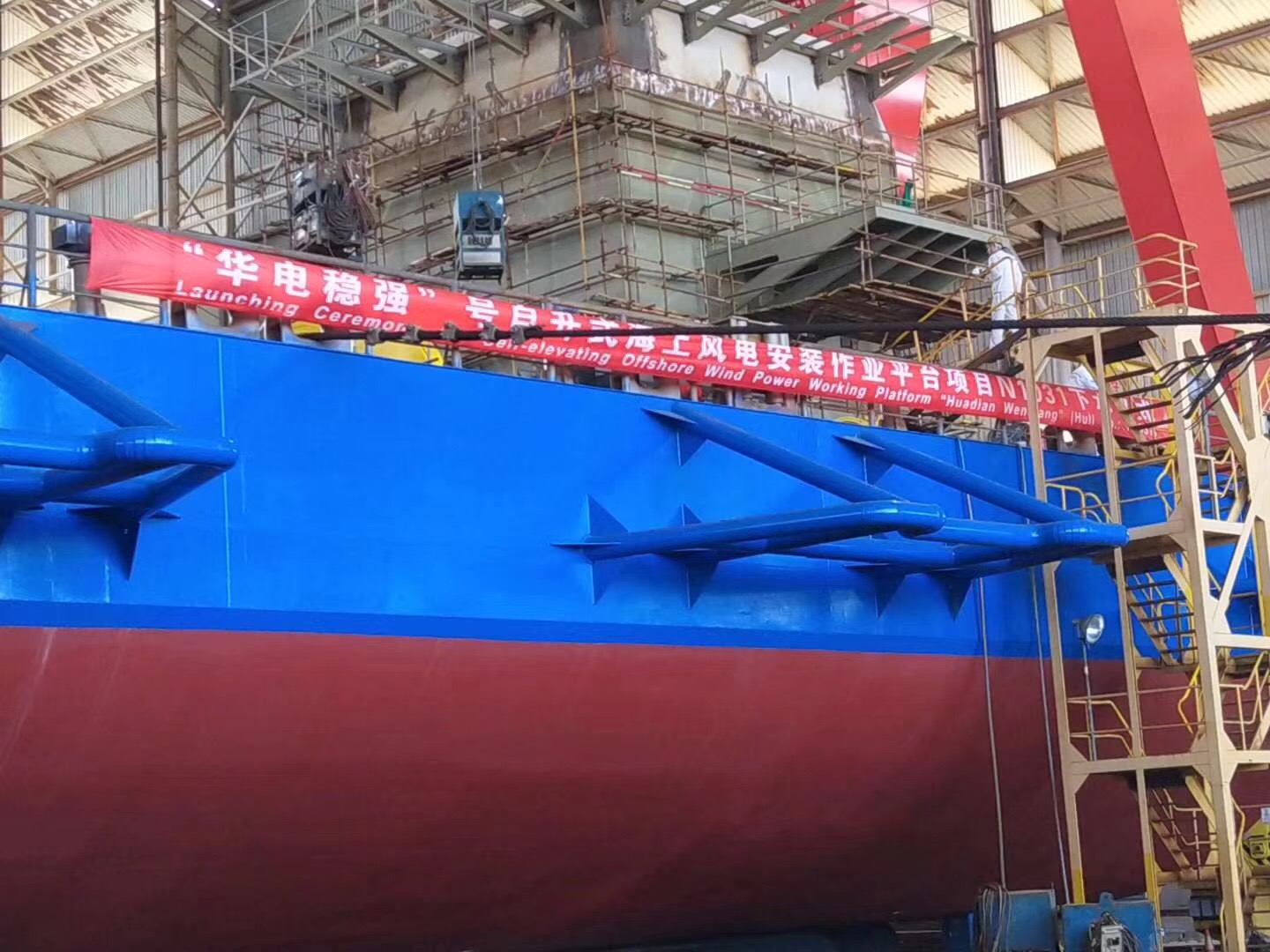 熱烈祝賀由南通豪通船務(wù)在潤邦海洋總包主船體搭載工程的“華電穩(wěn)強(qiáng)”號自升式海上風(fēng)電安裝作業(yè)平臺于2018年8月28日中午順利下水!