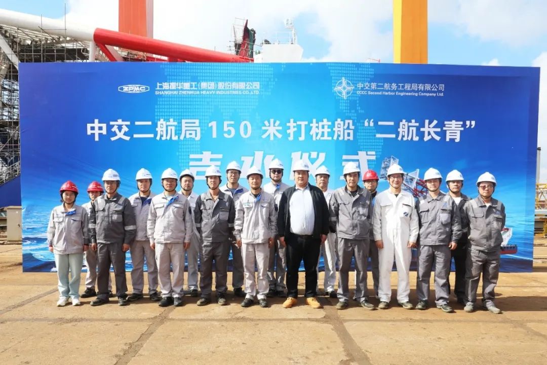 11月11日,上海振華重工為中交二航局建造的150米打樁船“二航長青”輪在振華海工舉行吉水儀式。